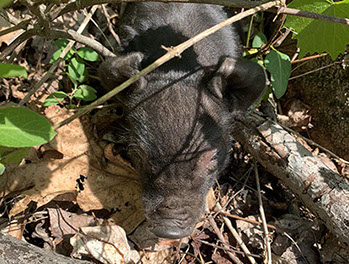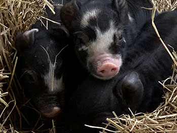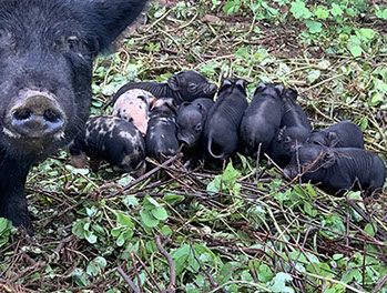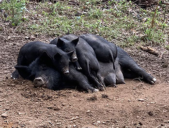 We never use antibiotics, vaccines, or any harsh chemicals anywhere on our farm. Our pigs forage and root on our pastures and in our woods, and are supplemented with local feed ground at a local mill. Every pig we sell has been lovingly born and raised here on our farm. We have cross-bred two heritage breeds, Berkshire and American Guinea Hog, for heartiness, meat quality, and a good fat-to-meat ratio.